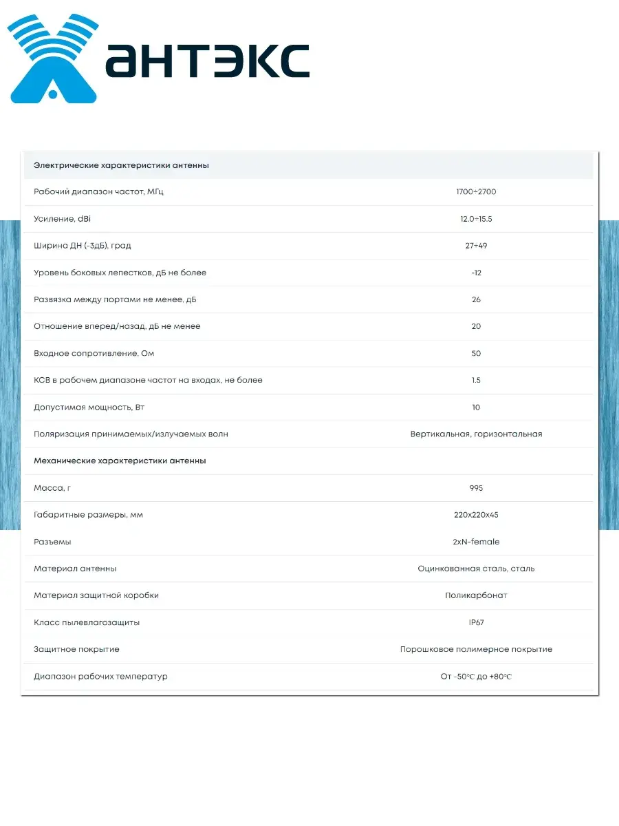 и в других системах диапазона 1700-2700 МГц. PETRA Broad Band MIMO 2x2 является антенной средней направленности и подходят для использования в системах связи на удалении до 10км. Тип антенны – синфазная полосковая решетка.Благодаря поддержки антеной технологии MIMO 2x2, скорость передачи данных может достигать 150 Мб/с (при использовании оборудования cat.4).