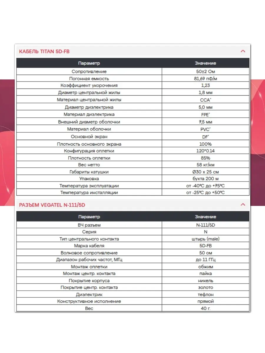 | Модель | Кабельная сборка 5D/FB (белый) (N-male - N-male) 10 м |