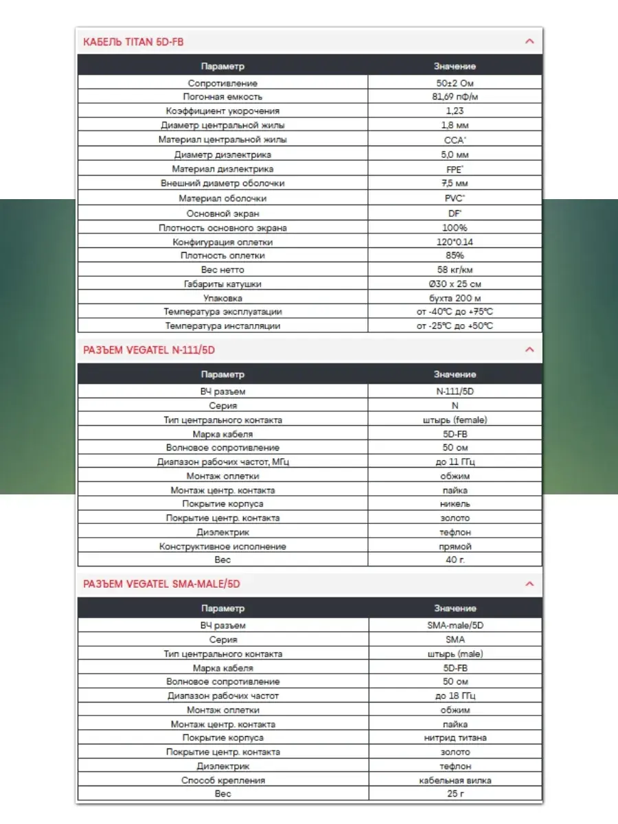 | Артикул | Кабельная сборка 5D/FB (N-female - SMA-male) 3 м |