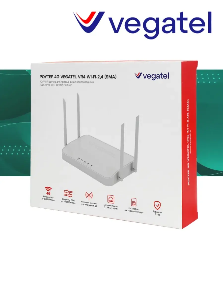 4G роутер VEGATEL VR4 работает с LTE 4-й категории (Cat.4), поддерживает все стандарты связи (LTE-FDD:B1/B3/B7/B8/B20/B28, LTE-TDD:B38/B40/B41, WCDMA:B1/B8, GSM/EDGE:B3/B8) и всех сотовых операторов России и СНГ.