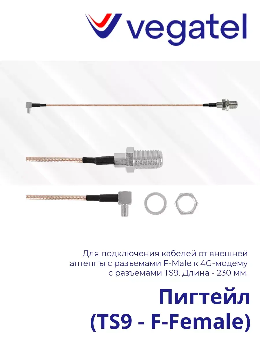 Пигтейлы TS9 – F-Female — переходники для подключения кабелей от внешней антенны с разъемами F-Male к 4G-модему с разъемами TS9. Длина каждого пигтейла — 230 мм.