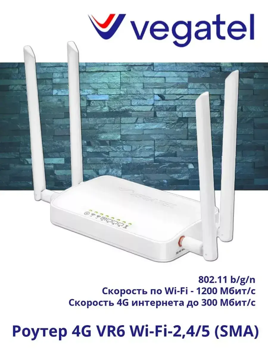 Двухдиапазонный Wi-Fi 4G роутер VEGATEL VR6 — ультимативное решение для дома или офиса. Роутер может получать интернет по кабелю или через сверхбыстрый (Cat.6) мобильный 4G/LTE-интернет со скоростью до 300 Мбит/с.