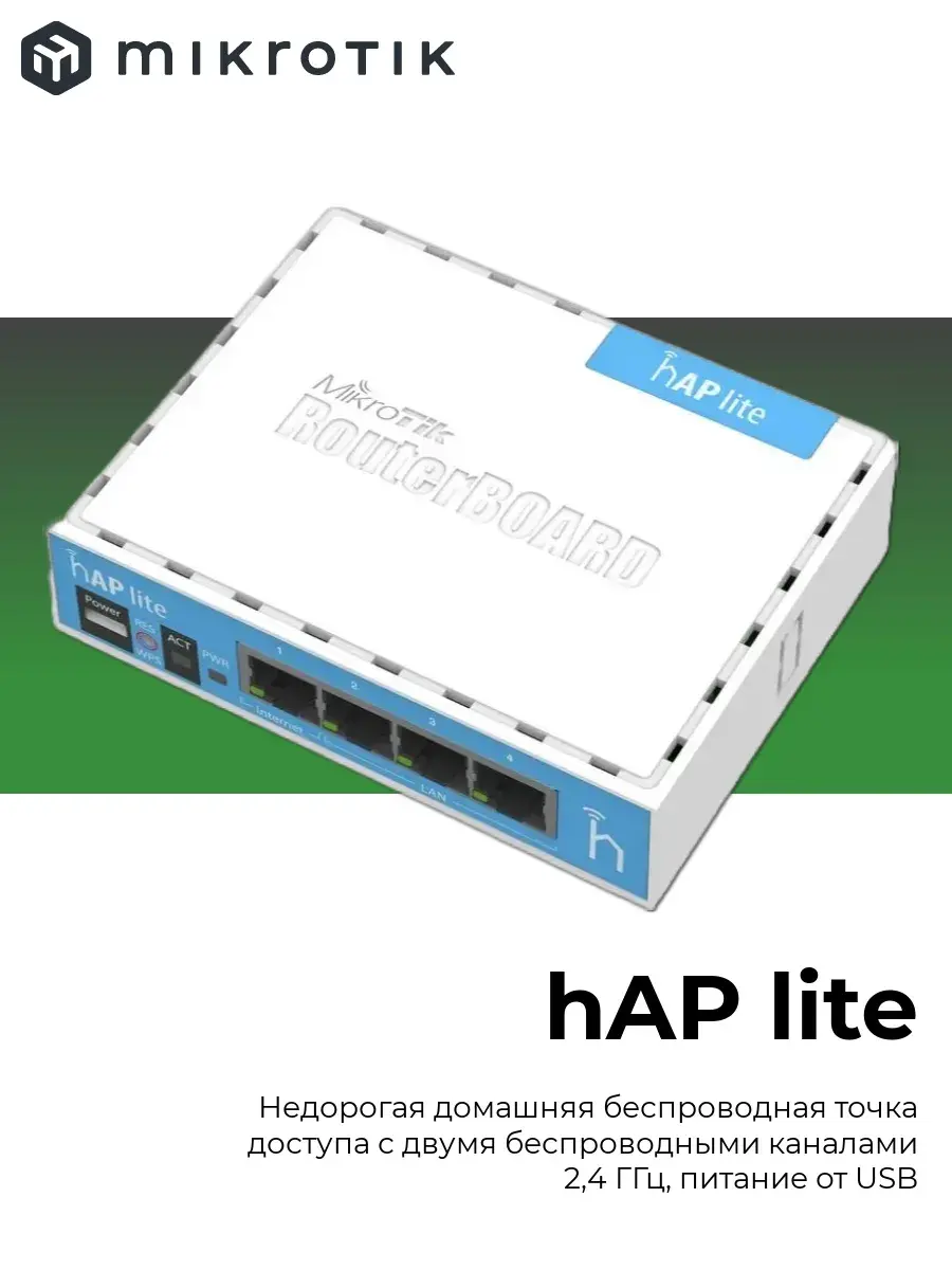 hAP lite оснащён мощным процессором с тактовой частотой 650 МГц, 32 МБ оперативной памяти, двухдиапазонным встроенным модулем беспроводной связи 2,4 ГГц, четырьмя портами Fast Ethernet и лицензией RouterOS L4. В комплект входит блок питания USB.
