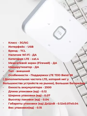 Роутер TCL MW42LM обеспечивает скорость приема информации из мобильной сети до 150 Мбит/с. Максимальная скорость передачи втрое ниже – 50 Мбит/с. Скорость обмена данными по Wi-Fi ограничена 150 Мбит/с. Защиту от внешних угроз обеспечивает межсетевой экран. Маршрутизатор компактен: он без каких-либо сложностей поместится в сумке для ноутбука. Кабель, необходимый для зарядки аккумулятора, входит в комплектацию устройства.