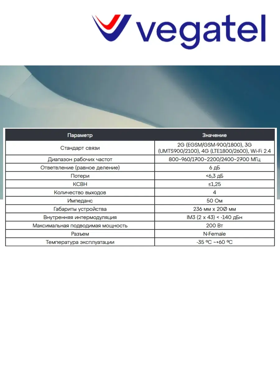 | Рабочий диапазон частот | 800~960/1700~2200/2400~2700 МГц |