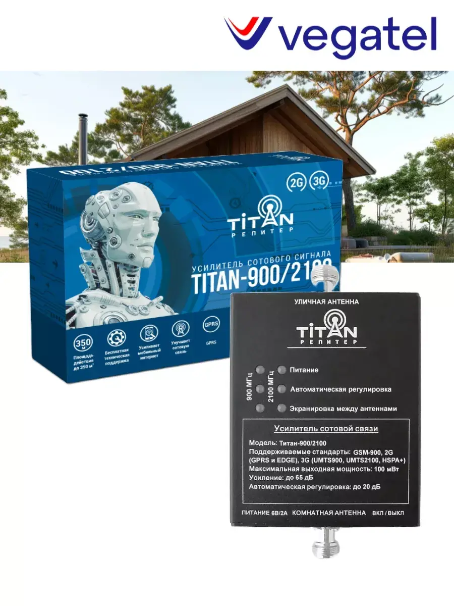 Комплект Titan-900/2100 состоит из усилителя (репитера) Titan-900/2100 и комплекта антенн MultiSet. Работает в стандартах связи GSM-900 (2G), UMTS900 (3G), UMTS2100 (3G, 2100 Мгц).