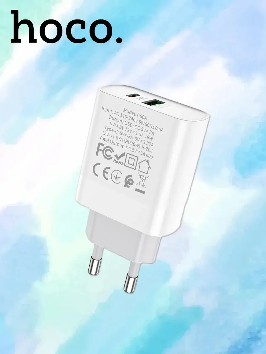 C80A Rapido, зарядное устройство PD20W + QC3.0, USB / Type-C выход, EU штекер. Набор с зарядным кабелем для Lightning на Type-C PD